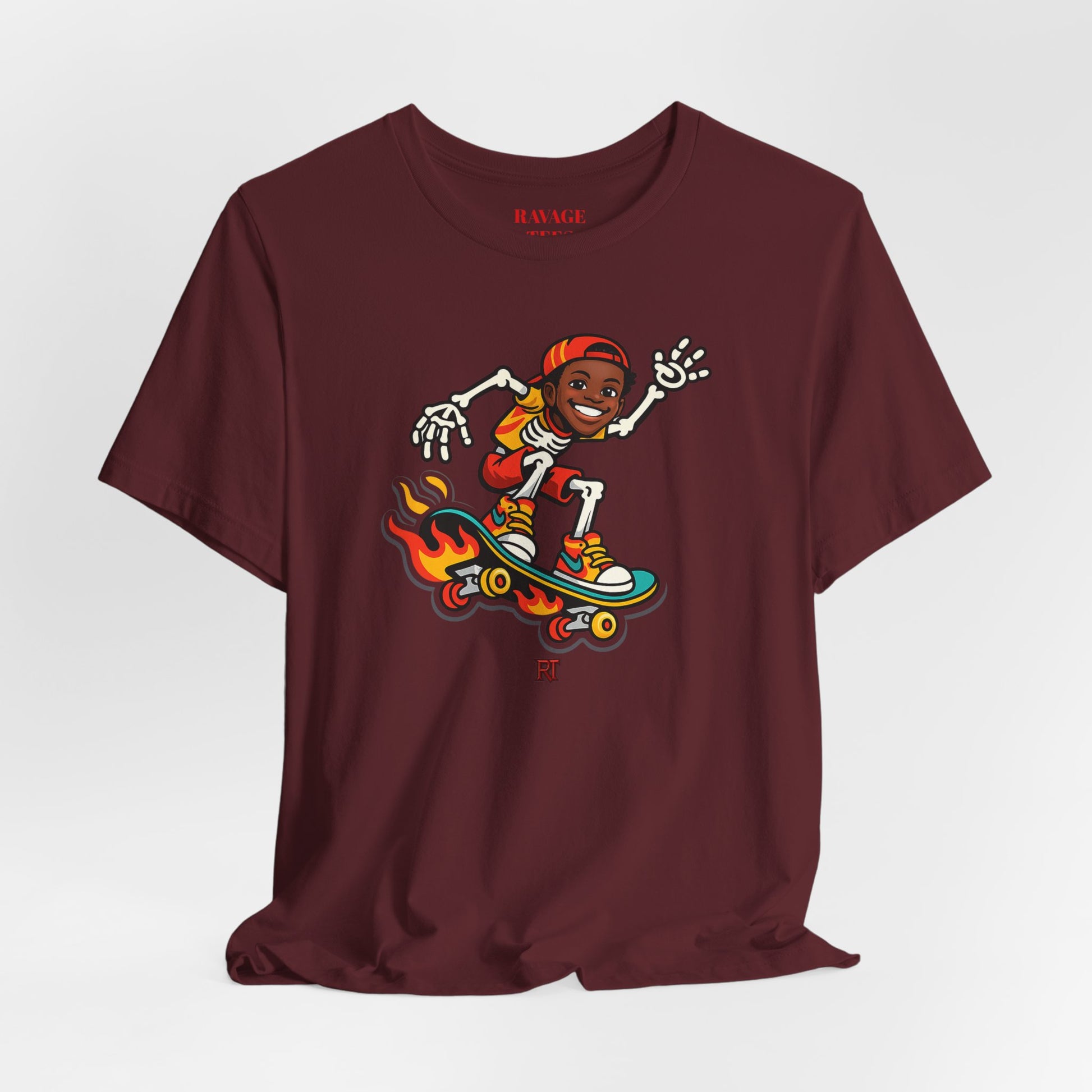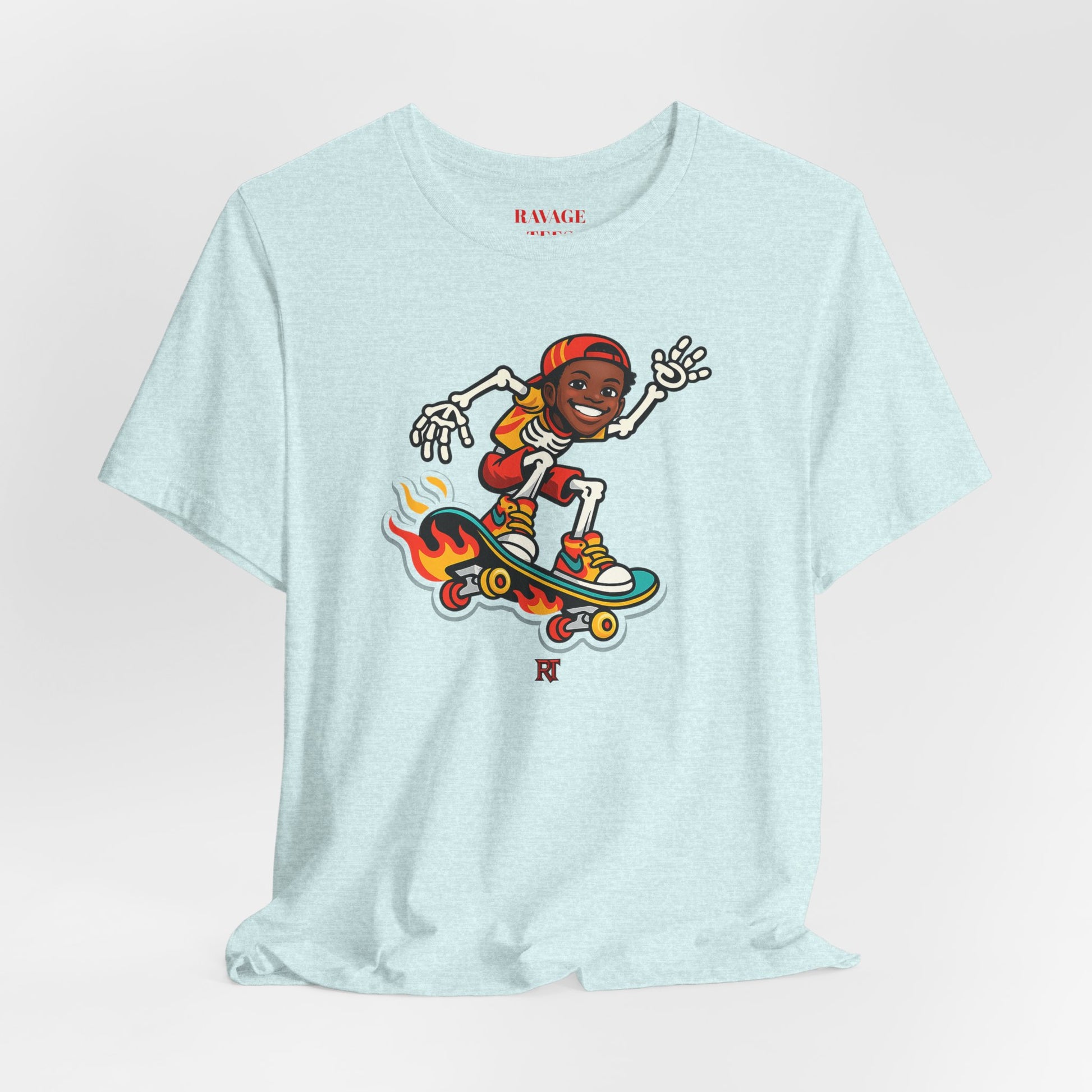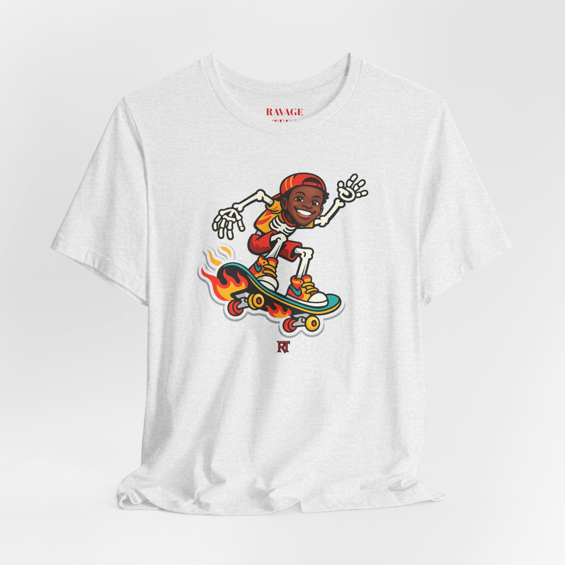 This lightweight jersey tee brings easygoing, skate‑inspired energy with a playful skeleton skater graphic on a flaming board and a clean back logo. Soft Airlume cotton, a ribbed crewneck, side seams, and durable finishing details make it a comfortable everyday layer for warm‑weather hangs, cooler nights, and anything in between.
