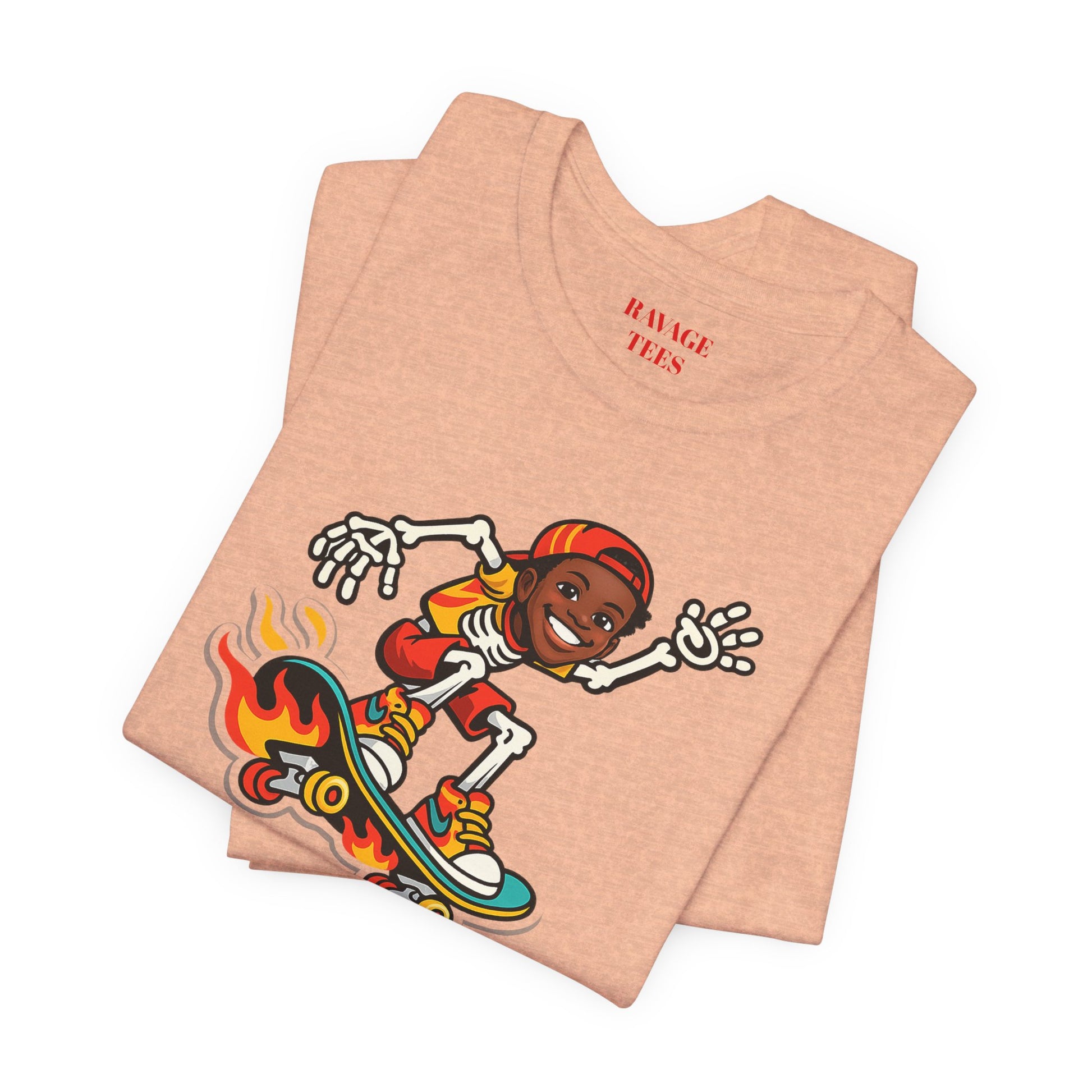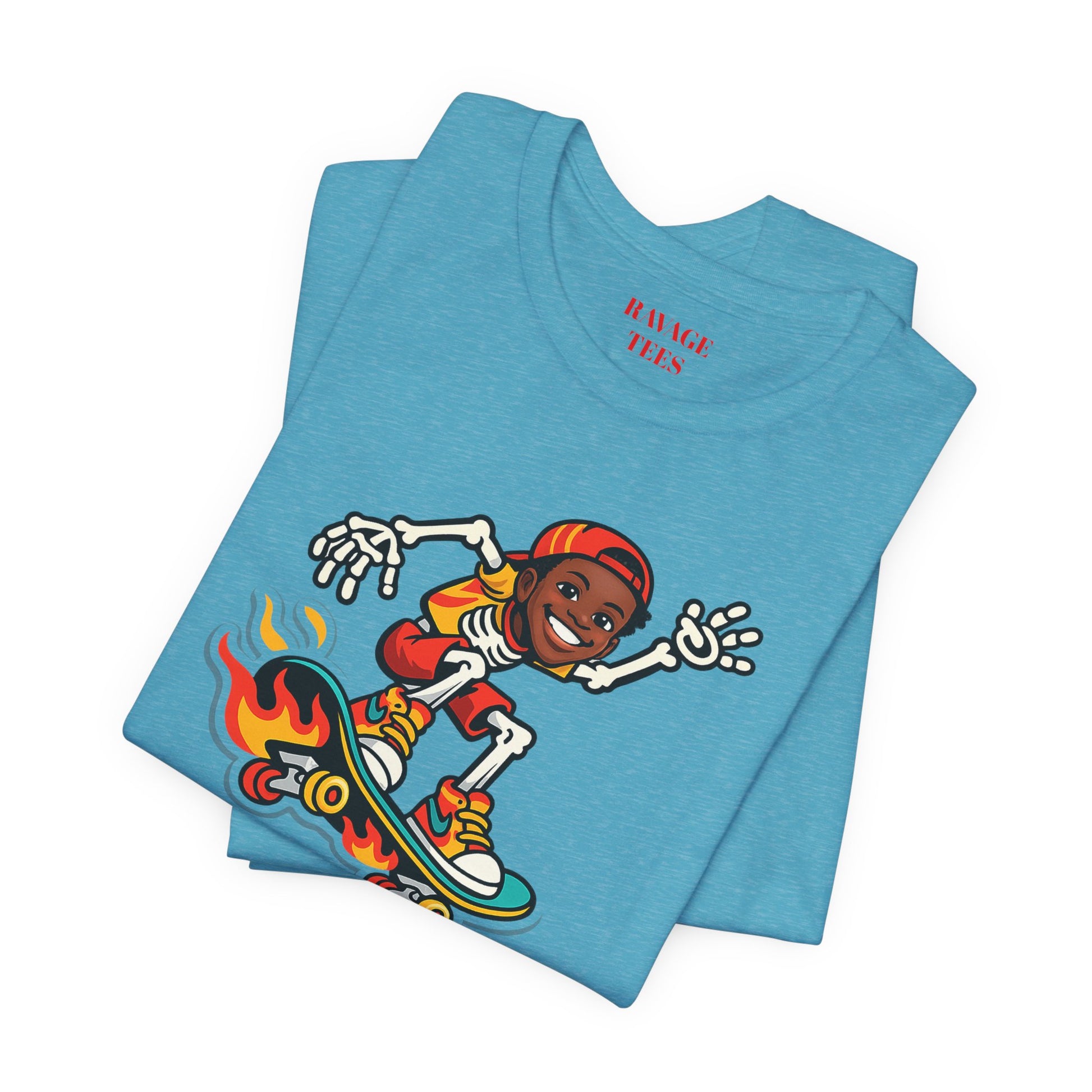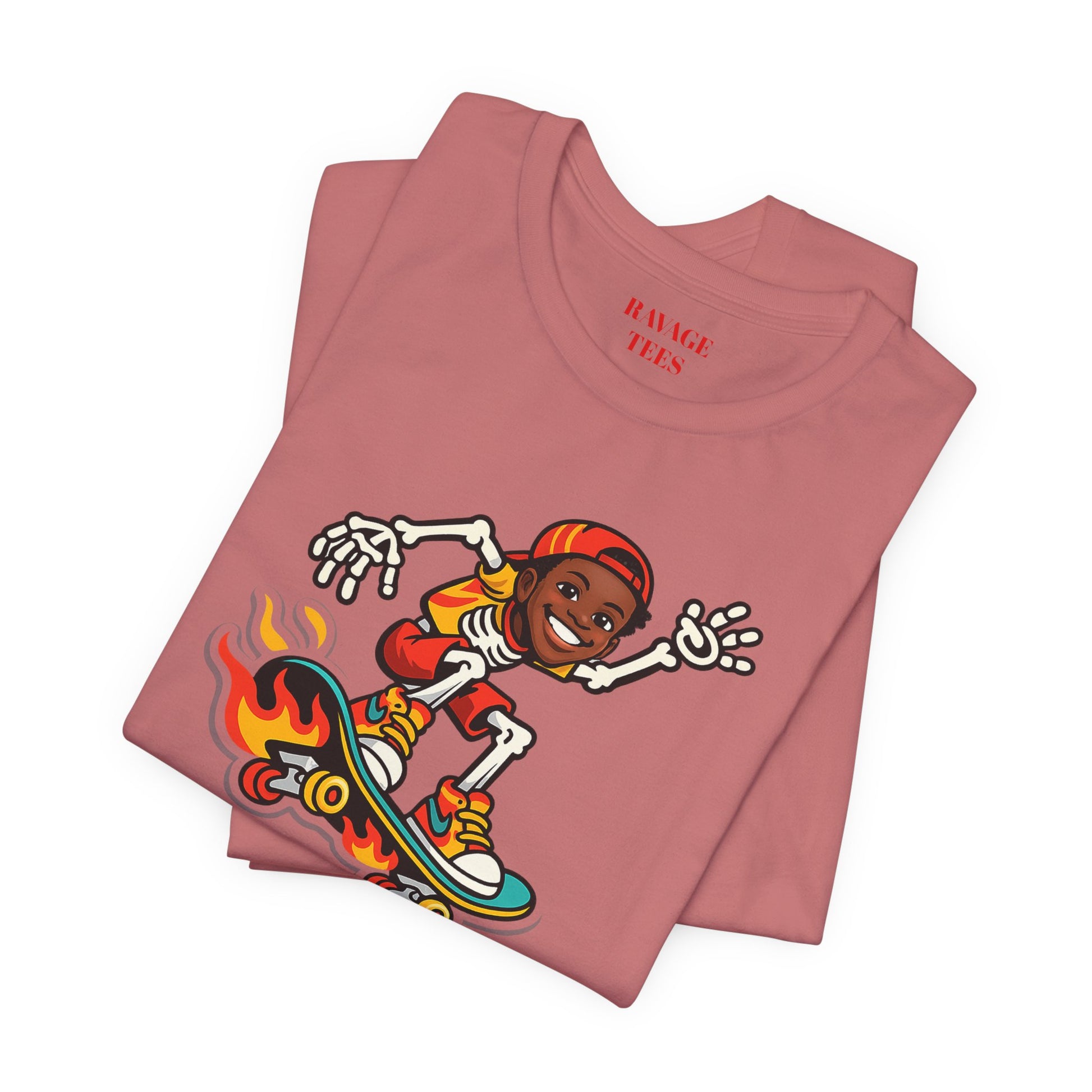 This lightweight jersey tee brings easygoing, skate‑inspired energy with a playful skeleton skater graphic on a flaming board and a clean back logo. Soft Airlume cotton, a ribbed crewneck, side seams, and durable finishing details make it a comfortable everyday layer for warm‑weather hangs, cooler nights, and anything in between.